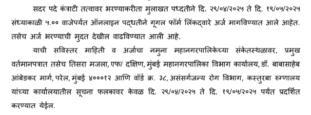 157 जागांसाठीबृहन्मुंबई महानगरपालिका भरती होत असून तसे नोटिफिकेशन जाहीर झाले आहे,इच्छुक उमेदवारांनी नोटिफिकेशन काळजीपूर्वक वाचायचे आहे आणि पात्र उमेदवार 19 मे 2025या शेवटच्या तारखेपर्यंत अर्ज करू शकतात.