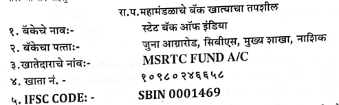 बँकेचे नाव : स्टेट बँक ऑफ इंडिया बँकेचा पत्ता : जुना आग्रा रोड़, सीबीएस, मुख्य शाखा, नाशिक खातेदाराचे नाव : MSRTC FUND A/C खाता नंबर : 10980246658 IFSC Code : SBIN 0001469