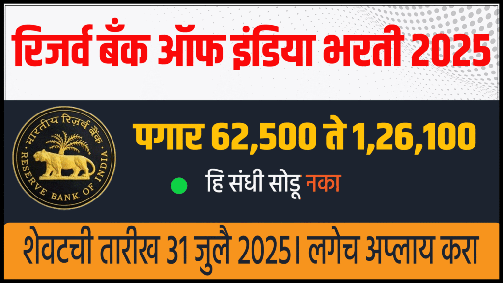 Reserve Bank of India Recruitment 2025 मध्ये Grade A आणि B (Specialist Officer) साठी 28 जागा भरली जात आहेत. अर्ज प्रक्रिया 11–31 जुलै 2025, Phase‑I तारीख 16 ऑगस्ट 2025 आहे. पात्रता आणि वयोमर्यादेच्या तपशीलांसहित अर्ज कसे करायचे ते वरील सारिणी व परिच्छेदांमध्ये दिले आहे. मनस्वी तयारीसाठी अधिकृत अधिसूचना काळजीपूर्वक वाचावी.